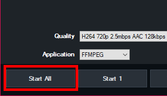Streams can also be controlled from the Streaming Settings window by selecting the top stream button to select the stream, then the Start x / Stop x button at the bottom of the window.