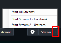 To start or stop a particular stream, click the arrow next to the Stream button in the main vMix window.