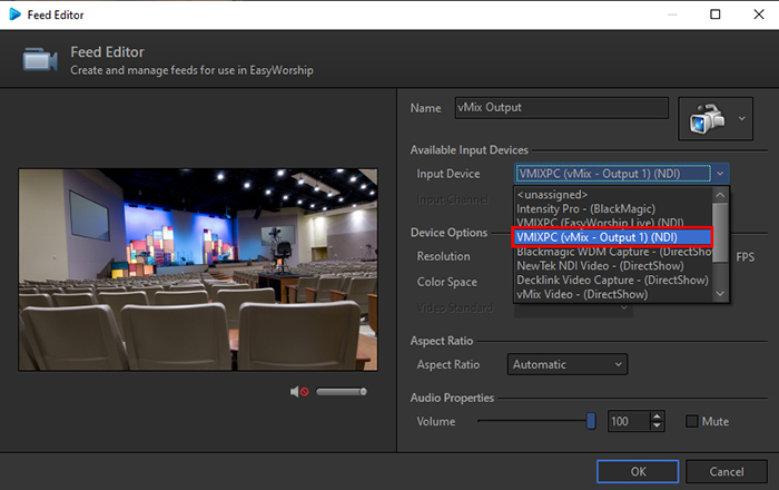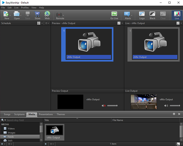 The vMix Output will now show up as one of your Media Feed options that you can use in your EasyWorship production.